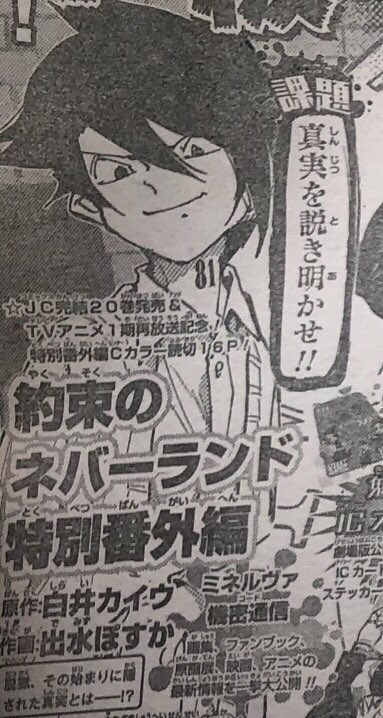 In der neuen Ausgabe der »Weekly Shonen Jump« wurde verkündet, dass die abgeschlossene Manga-Reihe »The Promised Neverland« (jap.: »Yakusoku no Neverland«) von Autor Shirai Kaiu und Zeichnerin Demizu Posuka ein 16-seitiges Side-Story-Kapitel erhält, das in der nächsten Ausgabe des Magazins, die am 5. Oktober 2020 in den Handel kommt, erscheint.