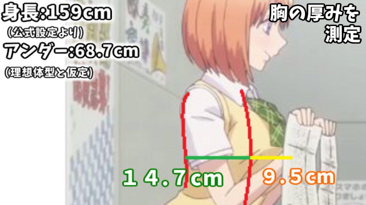Da im Anime stets betont wird, dass bei den Schwestern Statur und Körpergröße identisch sind, legte er lediglich bei Yotsuba Maß an und das Ergebnis gilt dementsprechend auch für Miku, Nino, Itsuki und Ichika. Im Originalwerk wird ein Brustumfang von 88 cm angegeben. Doch stimmt das wirklich oder offenbart uns die moderne Mathematik eine ganz andere Realität?