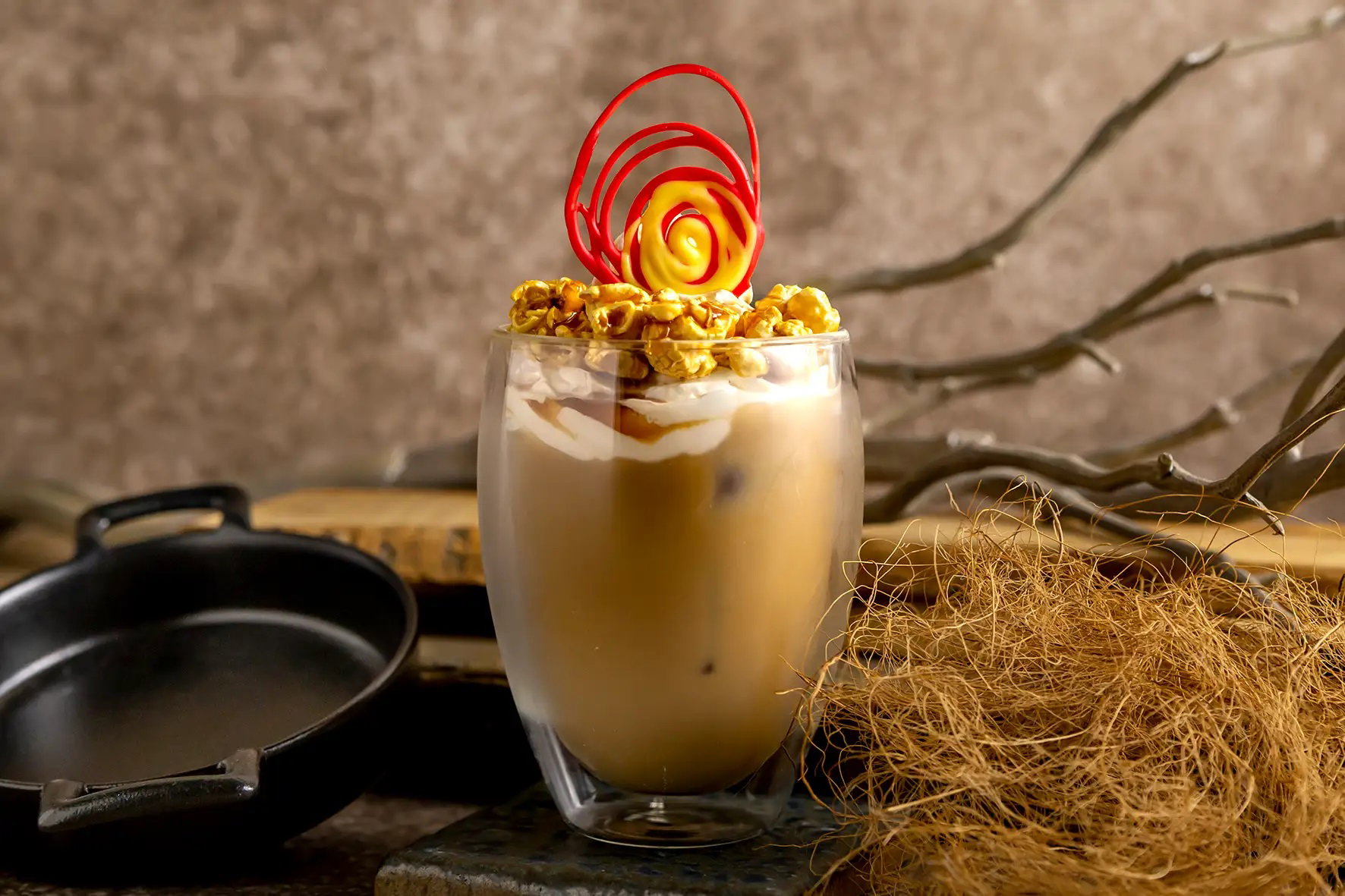 Ebenfalls an »Das wandelnde Schloss« ist der Drink »Fire Demon Caramel Au Lait« angelehnt. Der von dem Feuerdämon Calcifer inspirierte Caramel Au Lait kostet 820 Yen (rund 5,40 Euro) und bietet einen an Flammen erinnernden Schokoladenwirbel sowie einen Karamellpopcorn-Überzug.