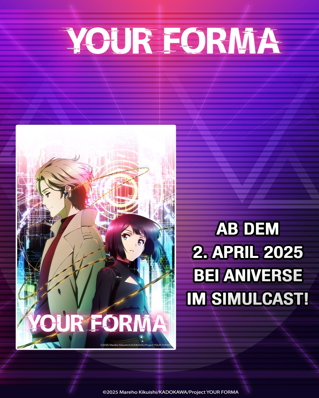 »Your Forma« wird ab dem 2. April 2025 im japanischen Fernsehen ausgestrahlt sowie bei aniverse mit deutschen Untertiteln im Simulcast gezeigt. Zu einem späteren Zeitpunkt folgt eine Home-Entertainment-Veröffentlichung.