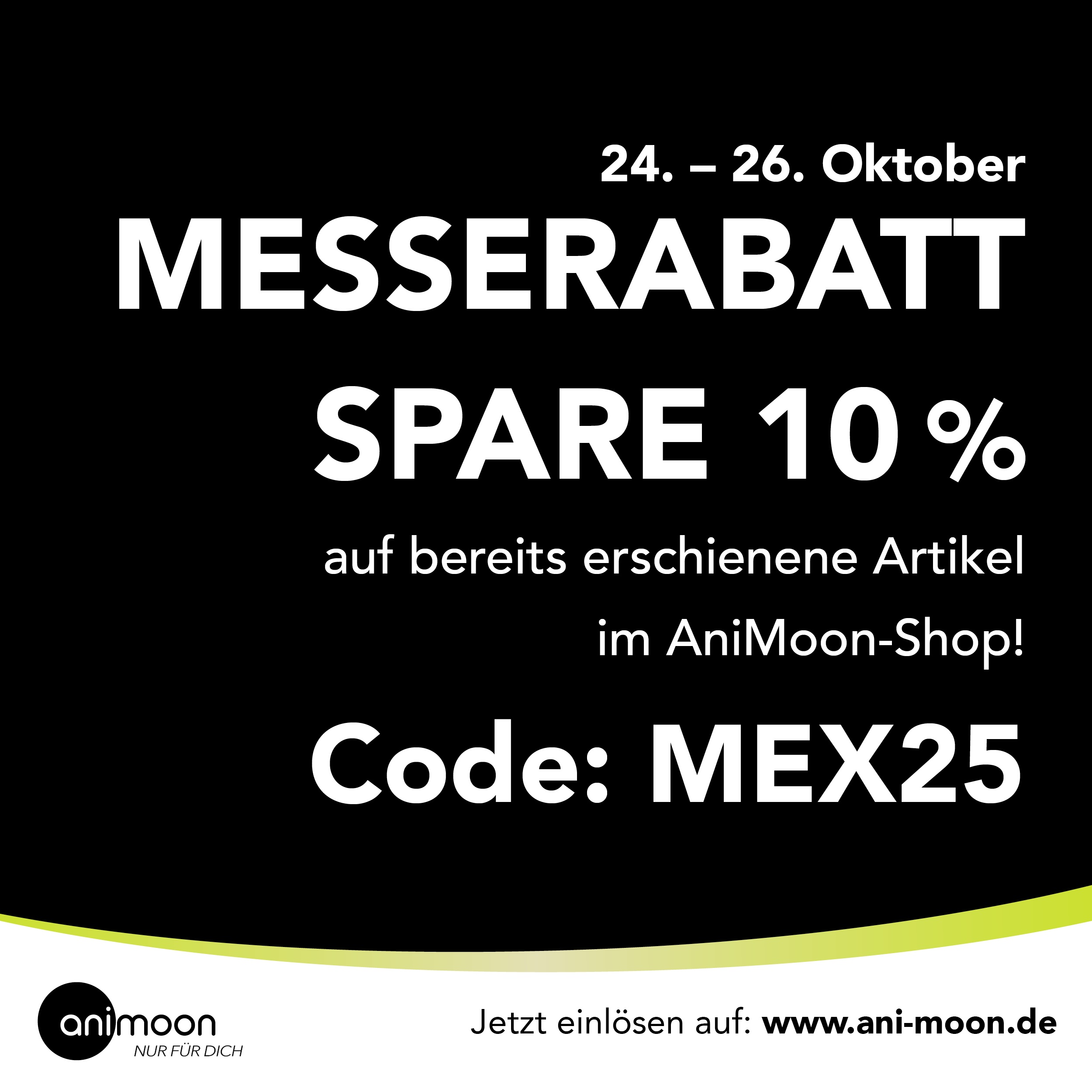 Vom 24. bis 26. Oktober 2025 bis 23:59 Uhr gibt es mit dem Gutscheincode MEX25 einen Rabatt in Höhe von 10 % auf alle bereits erschienenen DVDs, Blu-rays und Merchandise-Produkte im AniMoon-Shop. Preisgebundene Bücher des Labels MangaMoon sind von der Aktion ausgeschlossen.