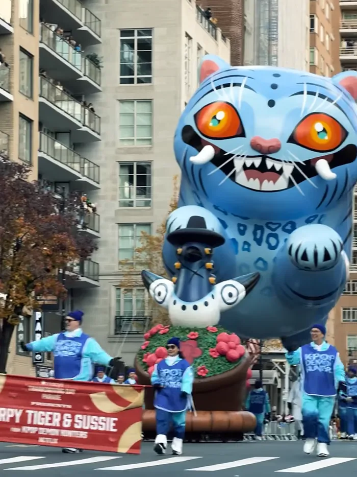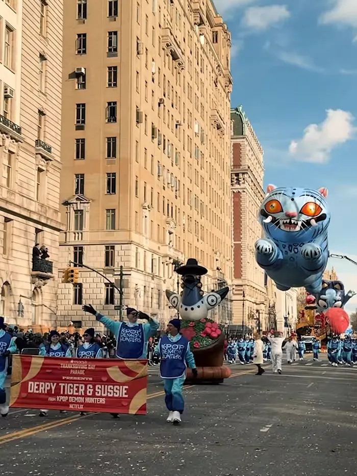 Die Rede ist natürlich von »KPop Demon Hunters«! Der beliebte Netflix-Titel war nicht nur mit einem überdimensionalen Ballon der blauen Dämonenkatze Derpy vertreten, sondern auch in Person von EJAE, Audrey Nuna und REI AMI, welche zusammen der fiktiven Band HUNTR/X ihre Stimmen leihen und den Zuschauern der Parade ihren Sommerhit »Golden« als Live-Performance präsentierten.